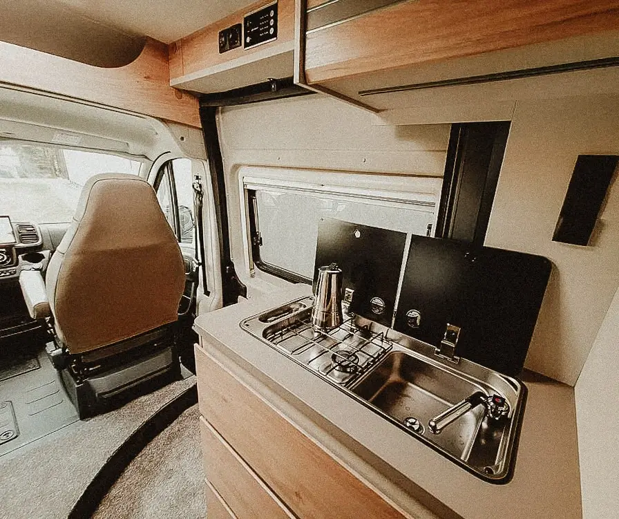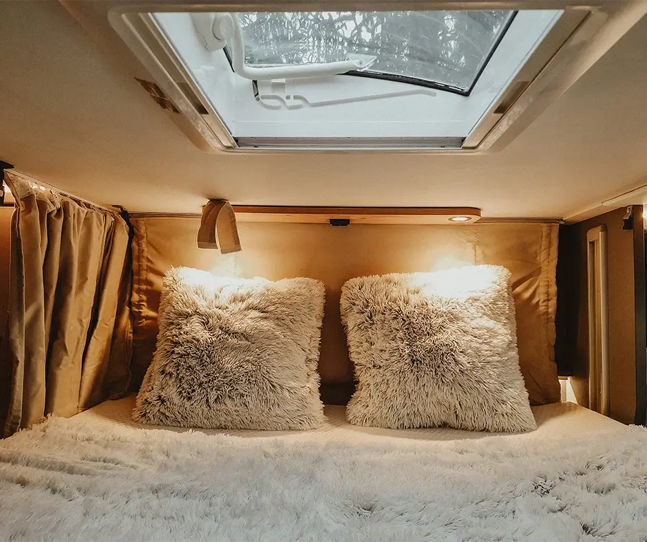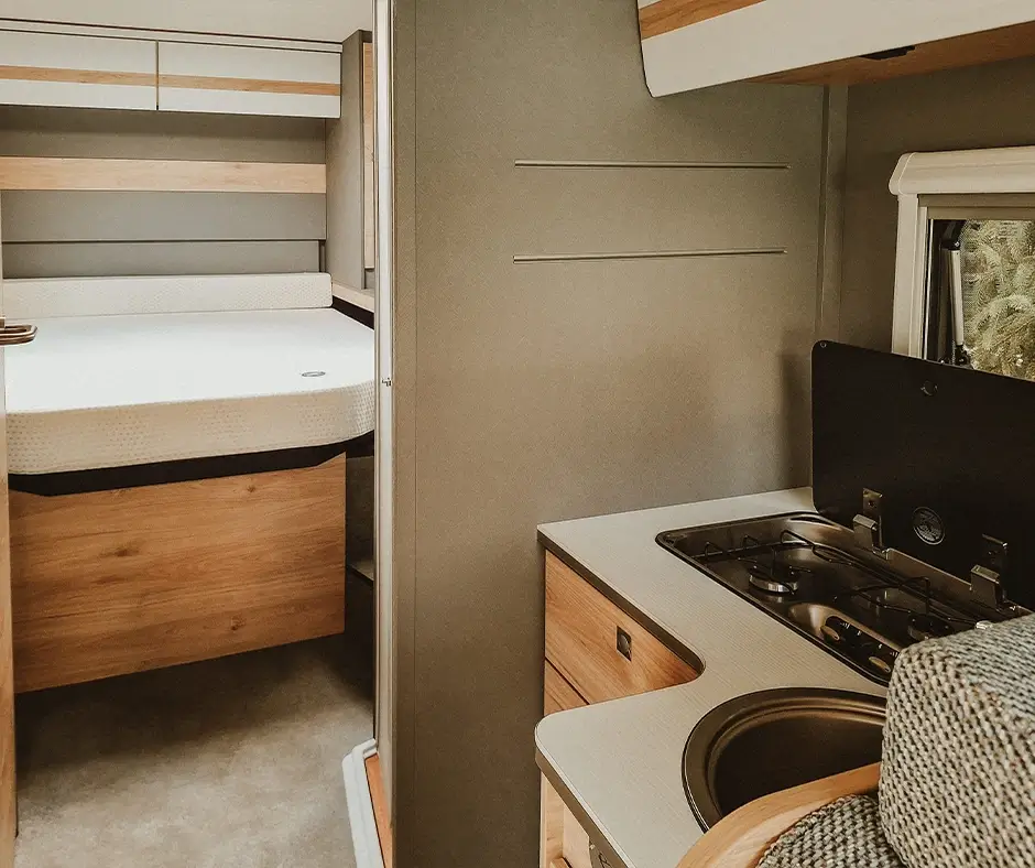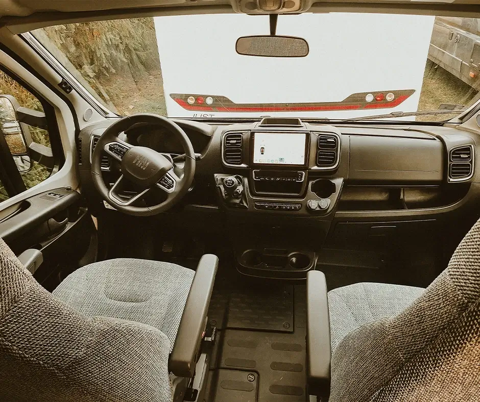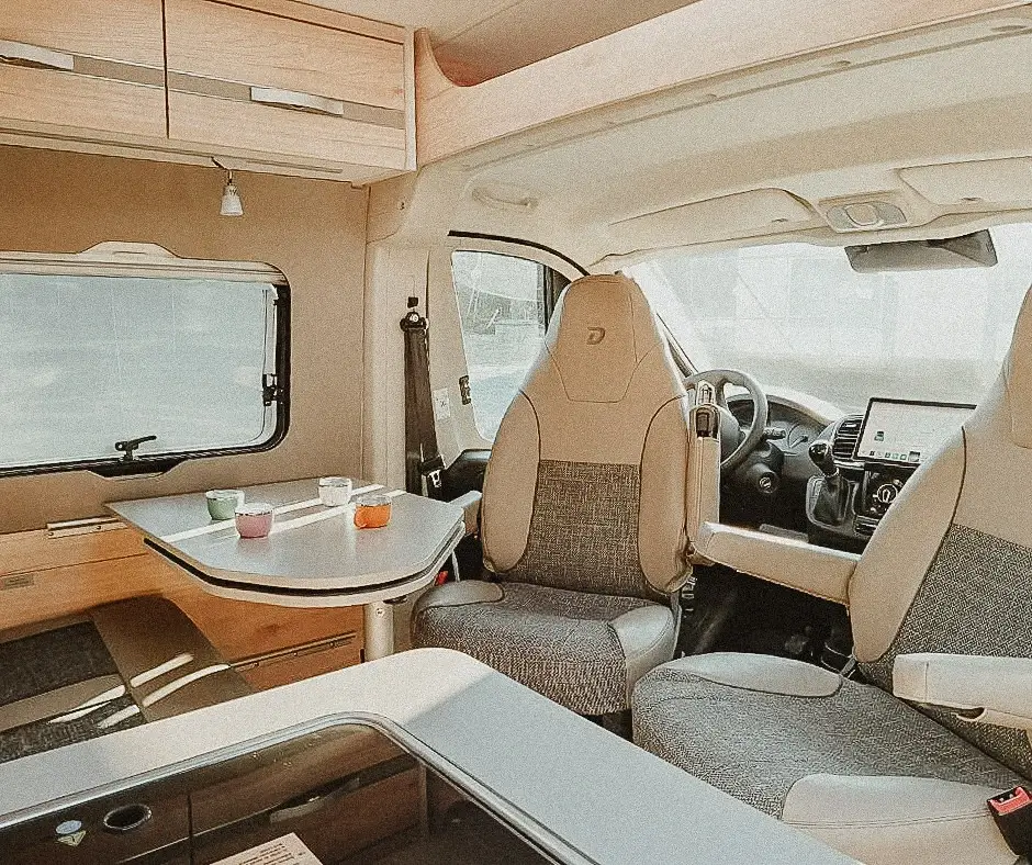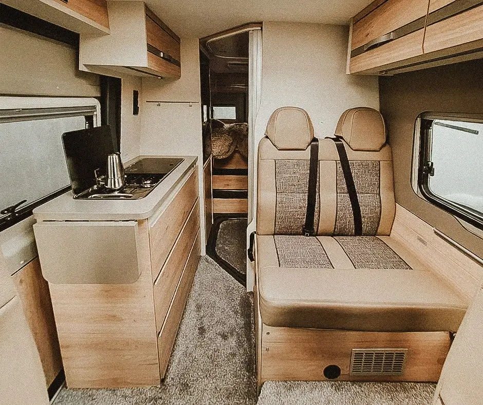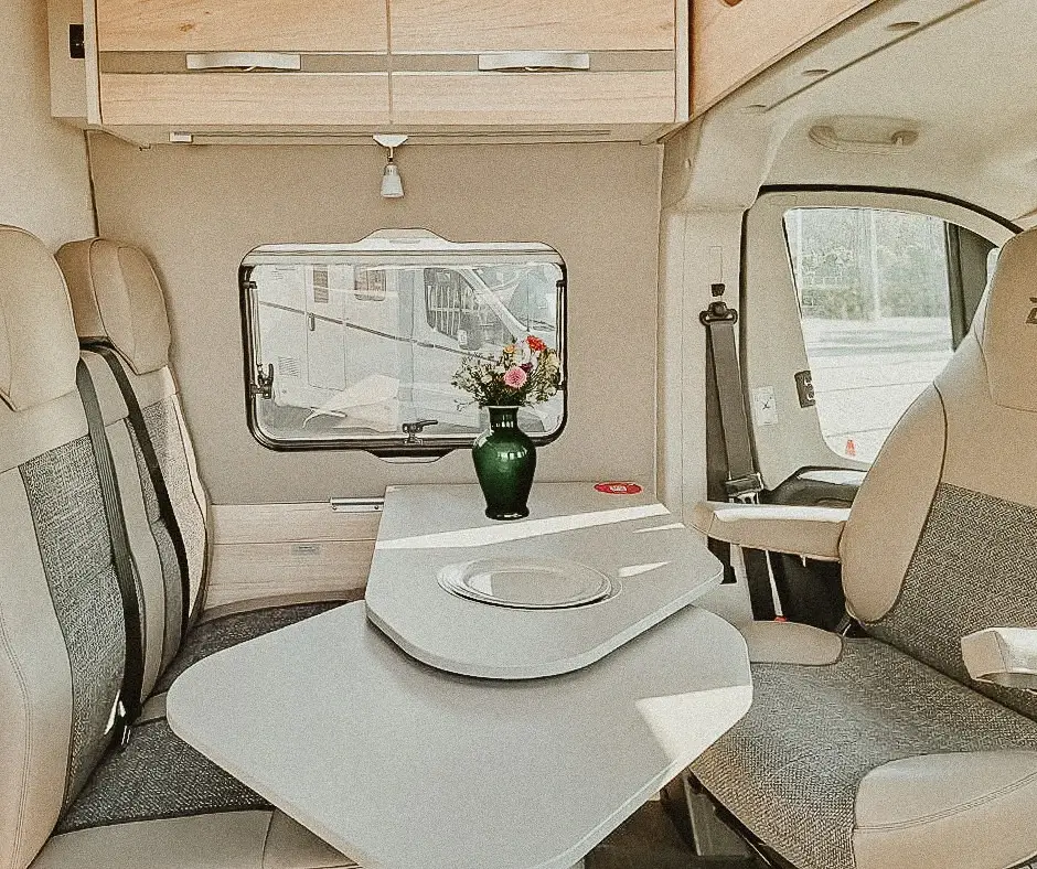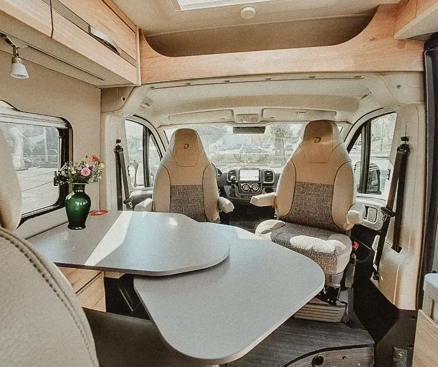 Letisztult belső, franciaágy, nőies vonalvezetés. Ha fontos neked a kényelem és a harmónia – ez a lakóautó a tökéletes útitárs.